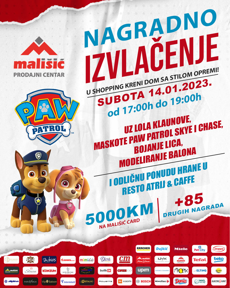Uz nagradno izvlačenje očekuje vas i druženje s Lola klaunovima i maskotama PawPatrolSkye i Chase, bojanje lica, modeliranje balona , kao i tombola za posjetitelje centra s vrijednim nagradama.