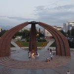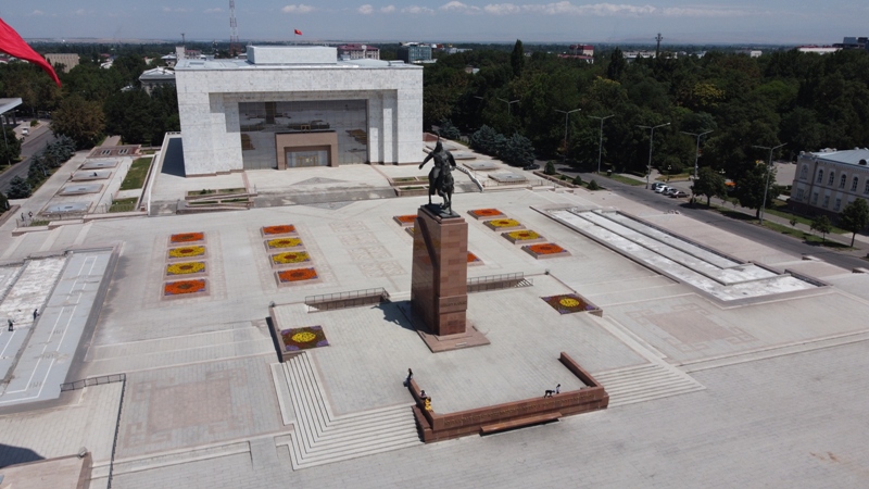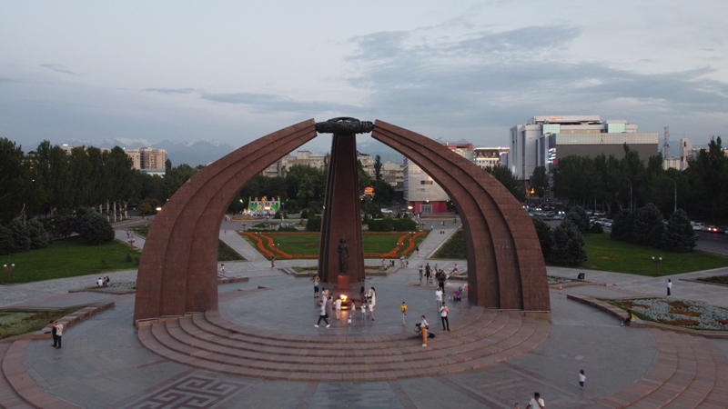 Manas hrabre čuva. Biškek je grad nastao još na Putu svile, a 1920-ih je godina planski izgrađen pod palicom Čeha i Slovaka. Godine 1926. preimenovan je po Mihailu Frunzeu (1885. − 1925.), velikom vojskovođi iz doba stvaranja SSSR-a, koji je rođen upravo tu, a umro je u Moskvi − pod nerazjašnjenim okolnostima. Nakon raspada Sovjetskog Saveza Biškeku je vraćeno staro ime.