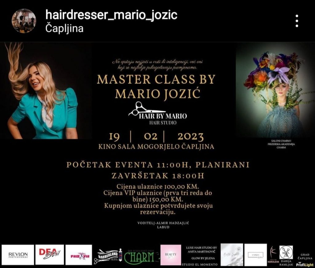 Poznati čapljinski Beauty salon pod vodstvom Maria Jozića najavljuje premijerni Hair Stylist Master Class pod nazivom “Master Class by Mario Jozić “, u organizaciji samog vlasnika, koji će se održati u nedjelju, 19. veljače 2023., s početkom u 11:00h u Kino dvorani “Mogorjelo” – Čapljina.