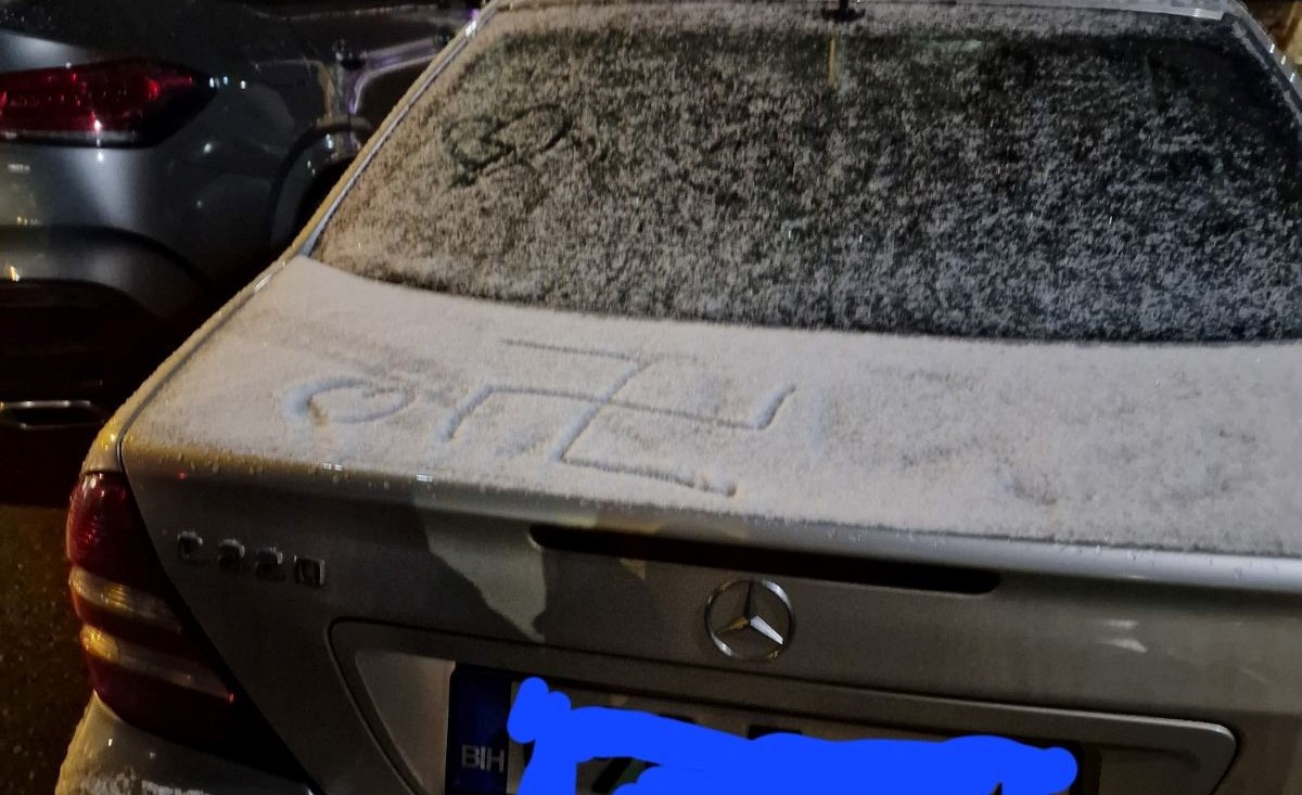 Na tankom sloju snijega koji je prekrio njegov automobil tog snježnog dana bio je isrctan sibmol nacističke Njemačke, svastika. Jasno se to vidi na fotografijama koje nam je ustupio, posebno zgrožen jer se incident dogodilo na Međunarodni dan sjećanja na žrtve holokausta kojima su hrvatski dužnosnici i mediji u BiH ove godine na poseban način odali počast.