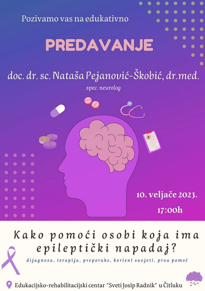 Edukacijsko-rehabilitacijski centar „Sveti Josip Radnik“ u petak, 10. veljače organizira edukativno predavanje. Predavanje će se održati u prostoru centra u Potpolju s početkom u 17 sati, a stručna predavačica na temu „Kako pomoći osobi koja ima epileptički napadaj?“ bit će doc. dr. sc. Nataša Pejanović – Škobić, dr. med.