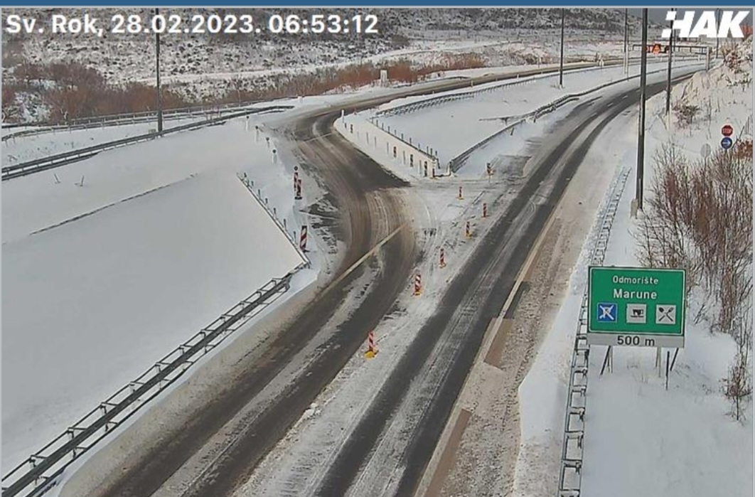 Na autocesti A1 Zagreb-Ploče-Karamatići između čvorova Sveti Rok i Posedarje ukinuta je zabrana zbog olujnog vjetra, ali na snazi su i dalje zimski uvjeti između čvorova Gospić i Maslenica (Rovanjska) i zabrana je prometa za kamione s prikolicama i tegljače s poluprikolicama, dok je za ostala vozila obavezna zimska oprema.