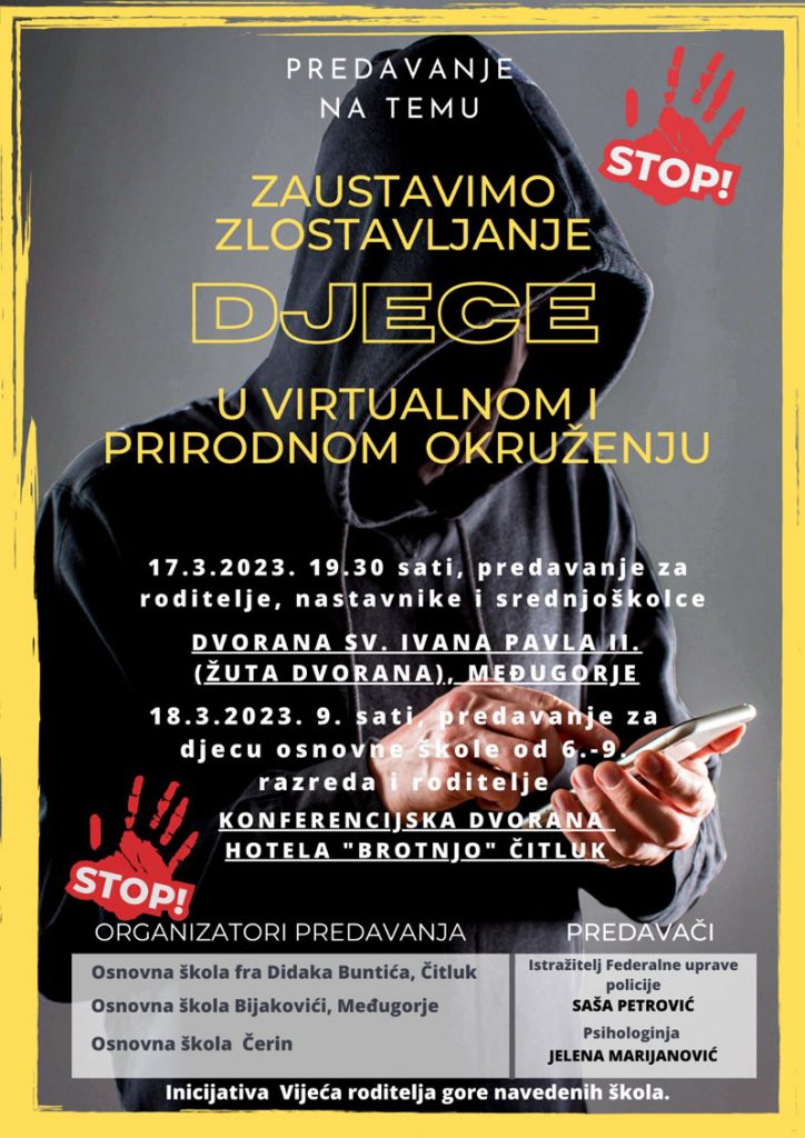 Vijeće roditelja i ravnatelja osnovnih škola s područja općine Čitluk: Osnovne škole fra Didaka Buntića Čitluk, Osnovne škole Čerin i Osnovne škole „Bijakovići“ organizira Javnu tribinu pod nazivom „Zaustavimo zlostavljanje djece u digitalnom i prirodnom okruženju“ koja će se održati u petak, 17. ožujka 2023. godine, u Dvorani Ivana Pavla II u Međugorju, s početkom u 19.30 sati.