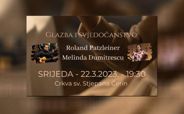 U srijedu, 22. ožujka 2023. u župnoj crkvi u Čerinu s početkom u 19:30 održat će se 5. Magnificat. Nastupaju: Roland Patzleiner i Melinda Dumitrescu, poznati glazbenici koji će nas kroz program voditi svjedočanstvom i pjesmom.