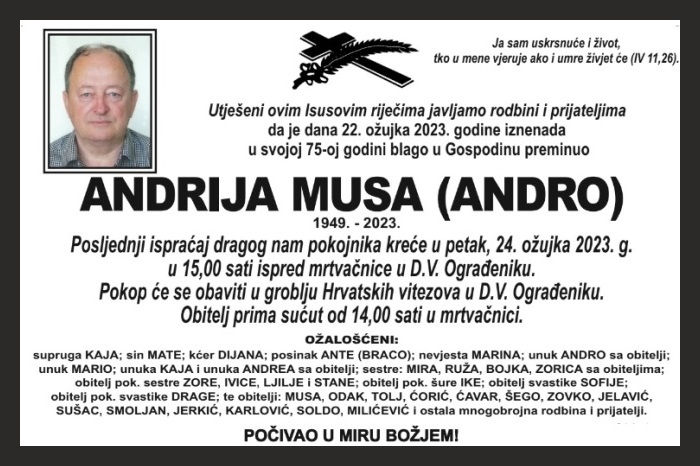 Posljednji ispraćaj pokojnika kreće u petak, 24. ožujka 2023. godine u 15:00 sati ispred mrtvačnice u D.V. Ograđeniku.