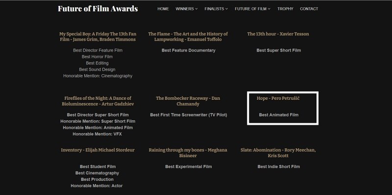 Do sad je osvojio prvo mjesto na Mjesečnoj dodjele filmskih nagrada Budućnost koji se održava u Ohridu Sjeverna Makedonija za najbolji animirani film.