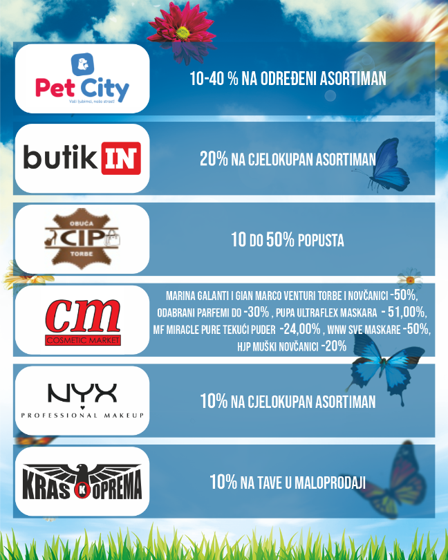 Cijenjeni kupci, ove subote, 01.travnja uživajte u odličnom shoppingu i pogodnostima koje vam donosi SPRING SHOPPING DAY u prodajnom centru Mališić Međugorje.