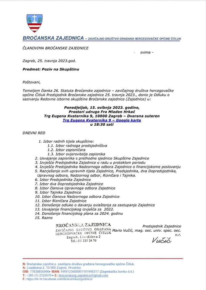Temeljem članka 26. Statuta Broćanske zajednice – zavičajnog društva hercegovačke općine Čitluk Predsjednik Broćanske zajednice 25. travnja 2023., donio je Odluku o sazivanju Redovne Izborne skupštine Broćanske zajednice.