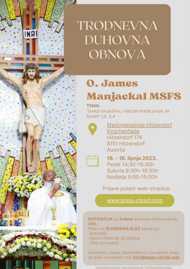 Hitzendorf, Austrija – Duhovna zajednica Logos Christi s radošću najavljuje trodnevnu duhovnu obnovu koju će predvoditi O. James Manjackal, istaknuti misionar pape Franje i misionar sv. Franje Saleškog. Događaj je posebno namijenjen Hrvatima u Austriji te će se održati od 16. do 18. lipnja 2023. godine u Kirschenhalle, Marktgemeinde Hitzendorf, Austrija.