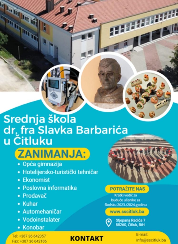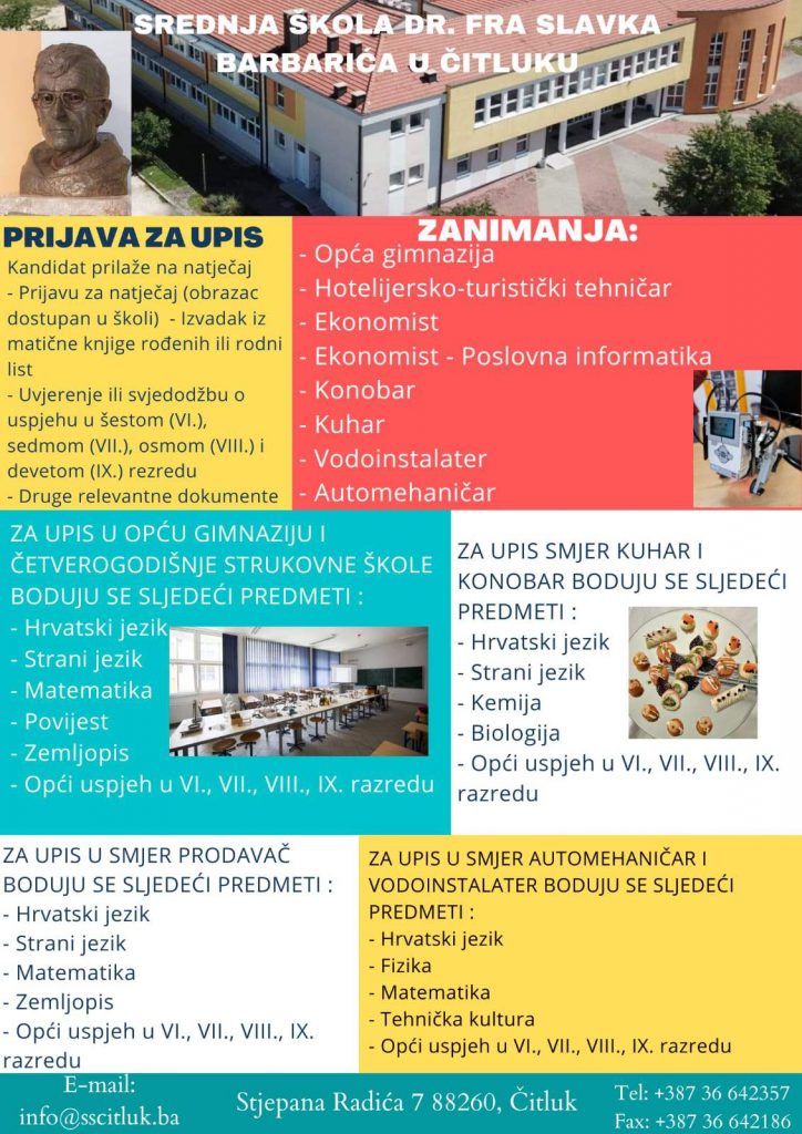 Prvi upisni rok za učenike prvih razreda u Srednjoj školi dr. fra Slavka Barbarića Čitluk je u utorak 20. lipnja 2023. u vremenu od 8 do 12 sati.