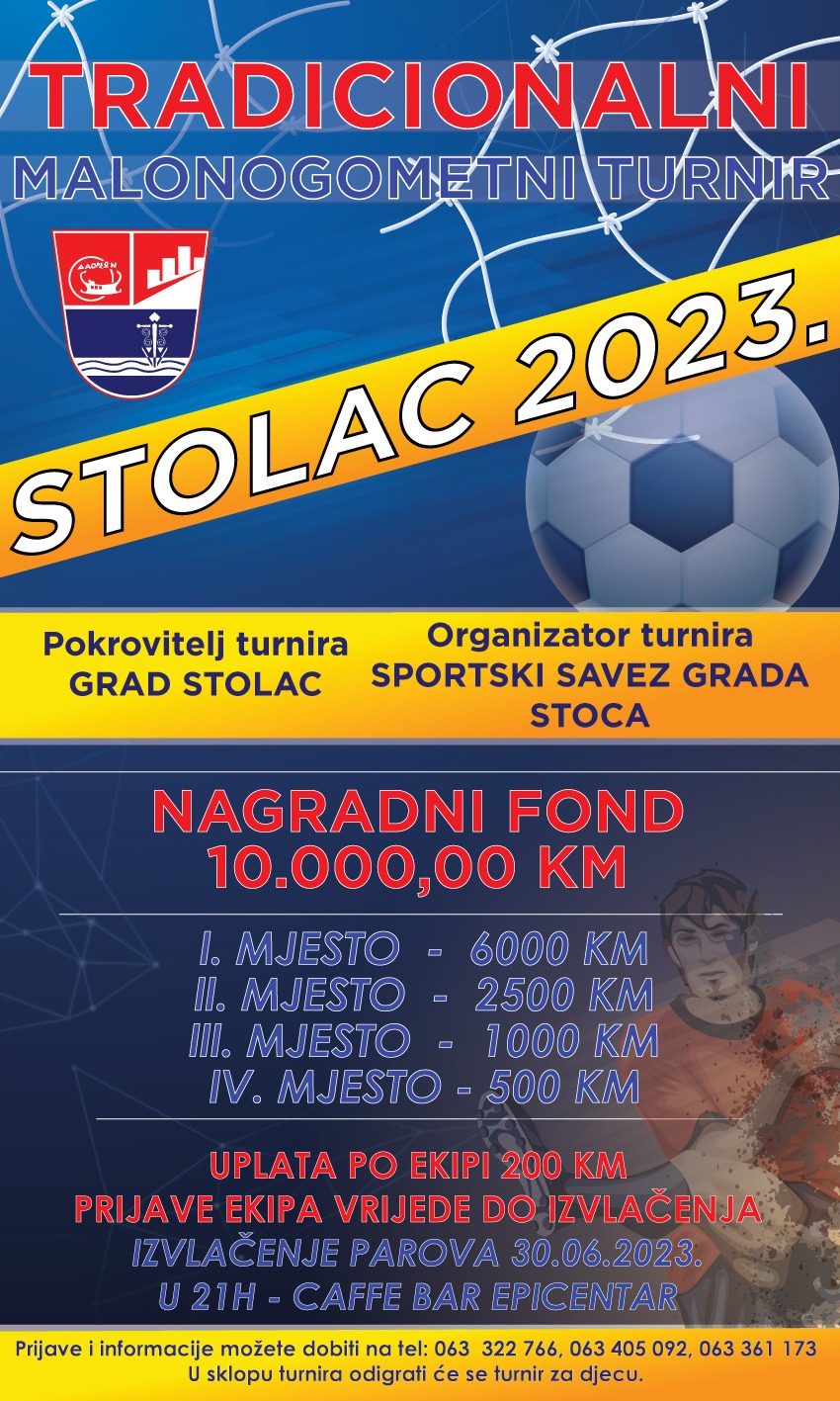 Povodom obilježavanja dana grada Stoca, Grad Stolac u suradnji sa Športskim savezom grada Stoca organizira Tradicionalni malonogometni turnir “STOLAC 2023” sa bogatim nagradnim fondom.