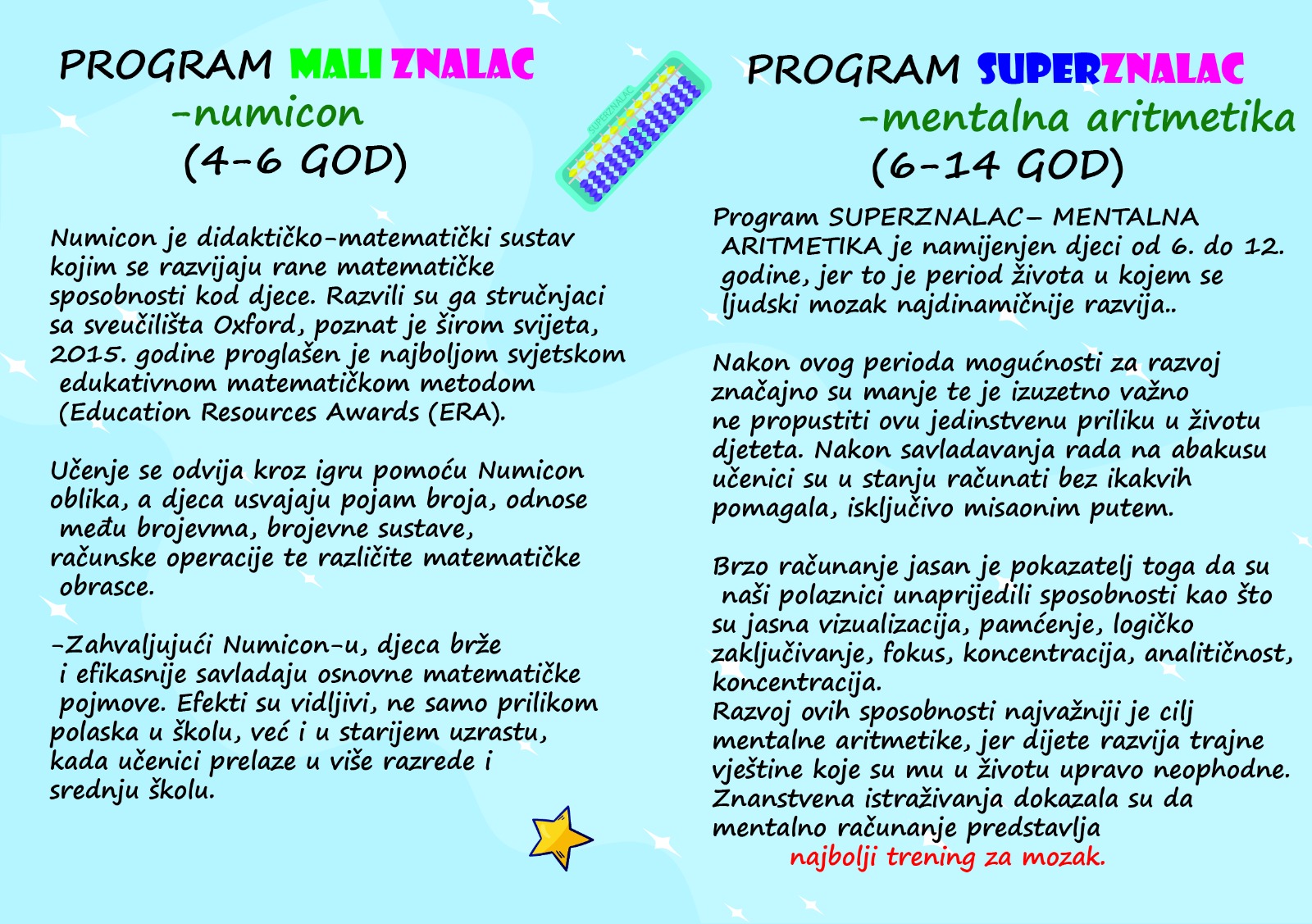 Superznalci uz navedene vještine savladavaju vještinu brzog računanja i rješavanja problema kroz tri programa: Mali znalac – brojevi kroz igru, Superznalac i IT znalac.