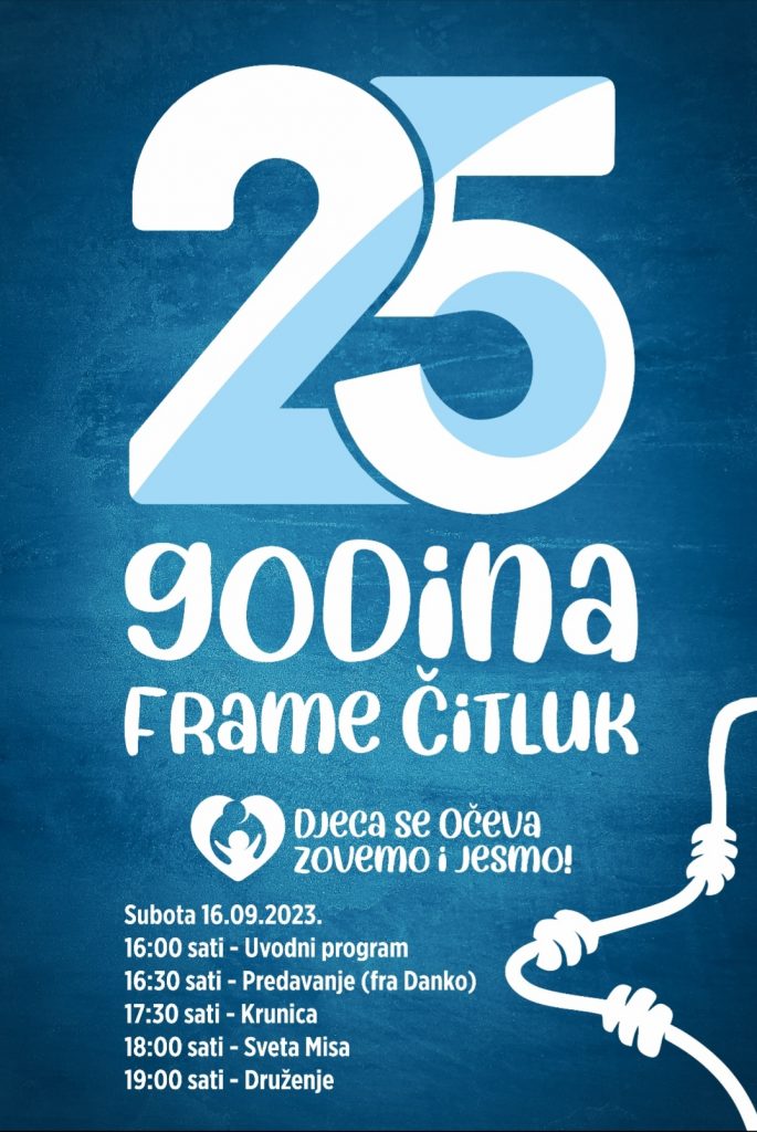 Frama Čitluk će ove subote, 16. rujna, proslaviti 25 godina svoga postojanja! Ovom proslavom želimo zahvaliti Bogu na svim milostima koje nam je dao kroz ovih 25 generacija!
