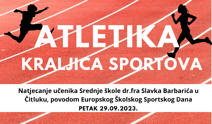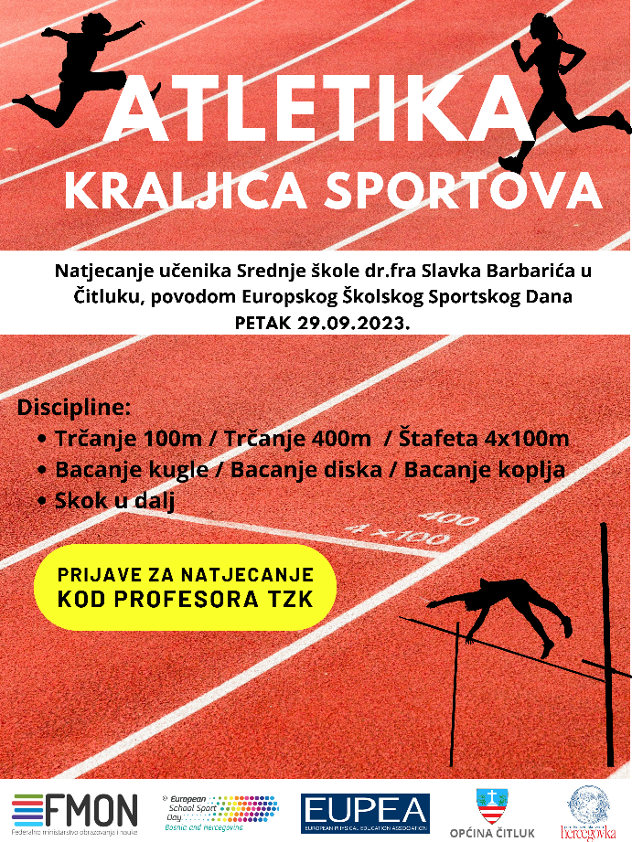 Povodom obilježavanja “Europskog školskog sportskog dana” u sklopu projekta “Atletika kraljica sportova” financiranog od Federalnog ministarstva obrazovanja i nauke, Srednjoškolski centar dr. fra Slavka Barbarića u Čitluku organizirati će se atletsko školsko sportsko natjecanja za učenice i učenike.