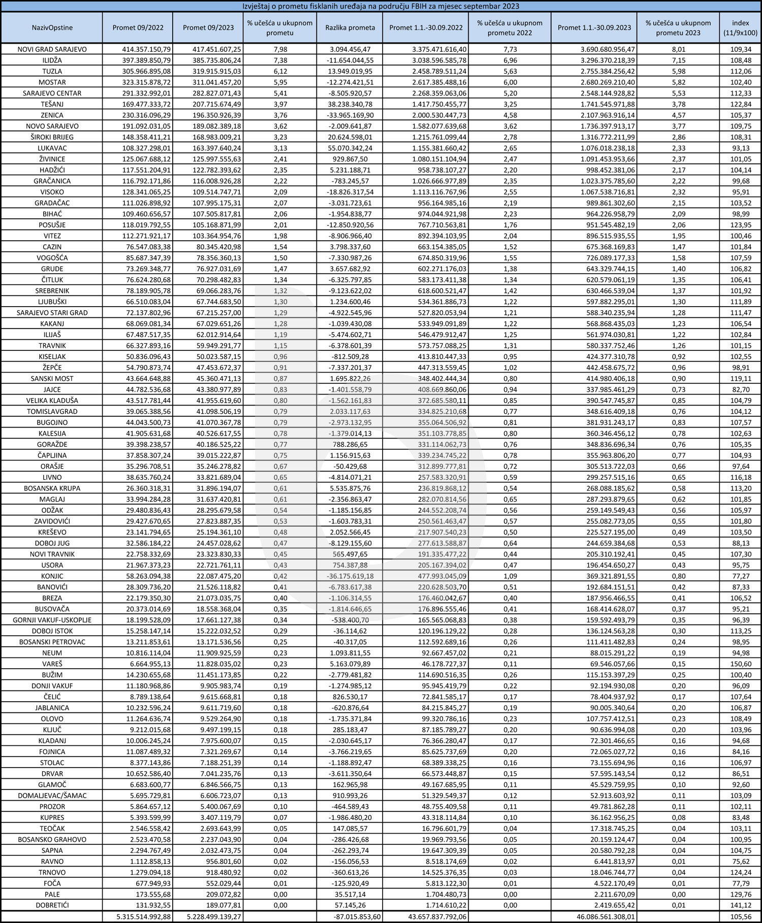 U odnosu na 30. rujna 2022. godine broj fiskalnih uređaja je veći za 5.043, a evidentirani promet u rujnu 2023. godine je manji u odnosu na rujan 2022. godine za 87.015.853,60 KM.