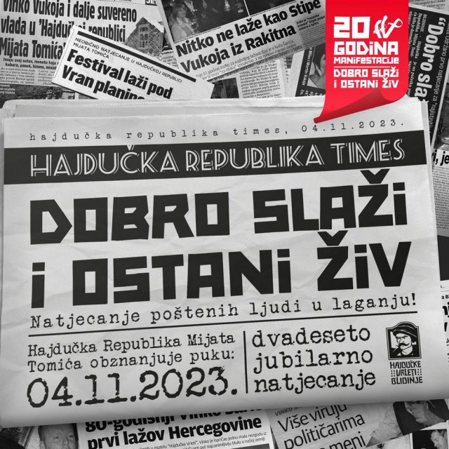 „E moj narode, Hajdučka Republika Mijata Tomića obznanjuje puku da će se dana 08.11.2003. godine održati prvo natjecanje poštenih ljudi u laganju pod nazivom „Dobro slaži i ostani živ“.