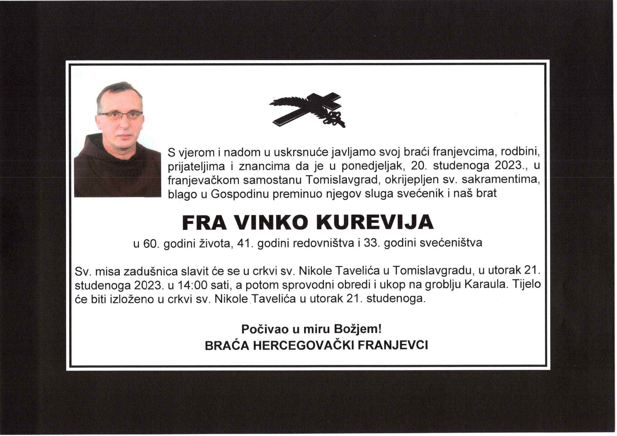 U ponedjeljak, 20. studenoga 2023., u franjevačkom samostanu Tomislavgrad, preminuo je fra Vinko Kurevija, 60. godini života, 41. godini redovništva i 33. godini svećeništva