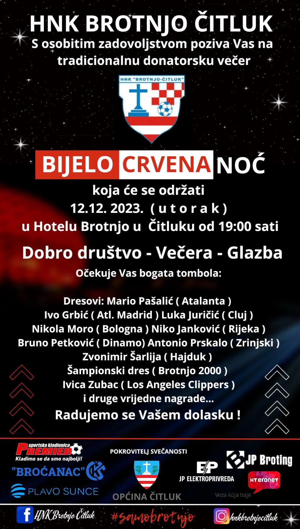 Stoga klub u ovo adventsko vrijeme tradicionalno i ove godine organizira klupsku donatorsku svečanost “Bijelo-crvenu noć” HNK Brotnjo-Čitluk s ciljem okupljanja svih prijatelja, članova, navijača kluba iz svih sfera javnog života općine Čitluk i šire, navedeno je u priopćenju HNK Brotnjo-Čitluk.