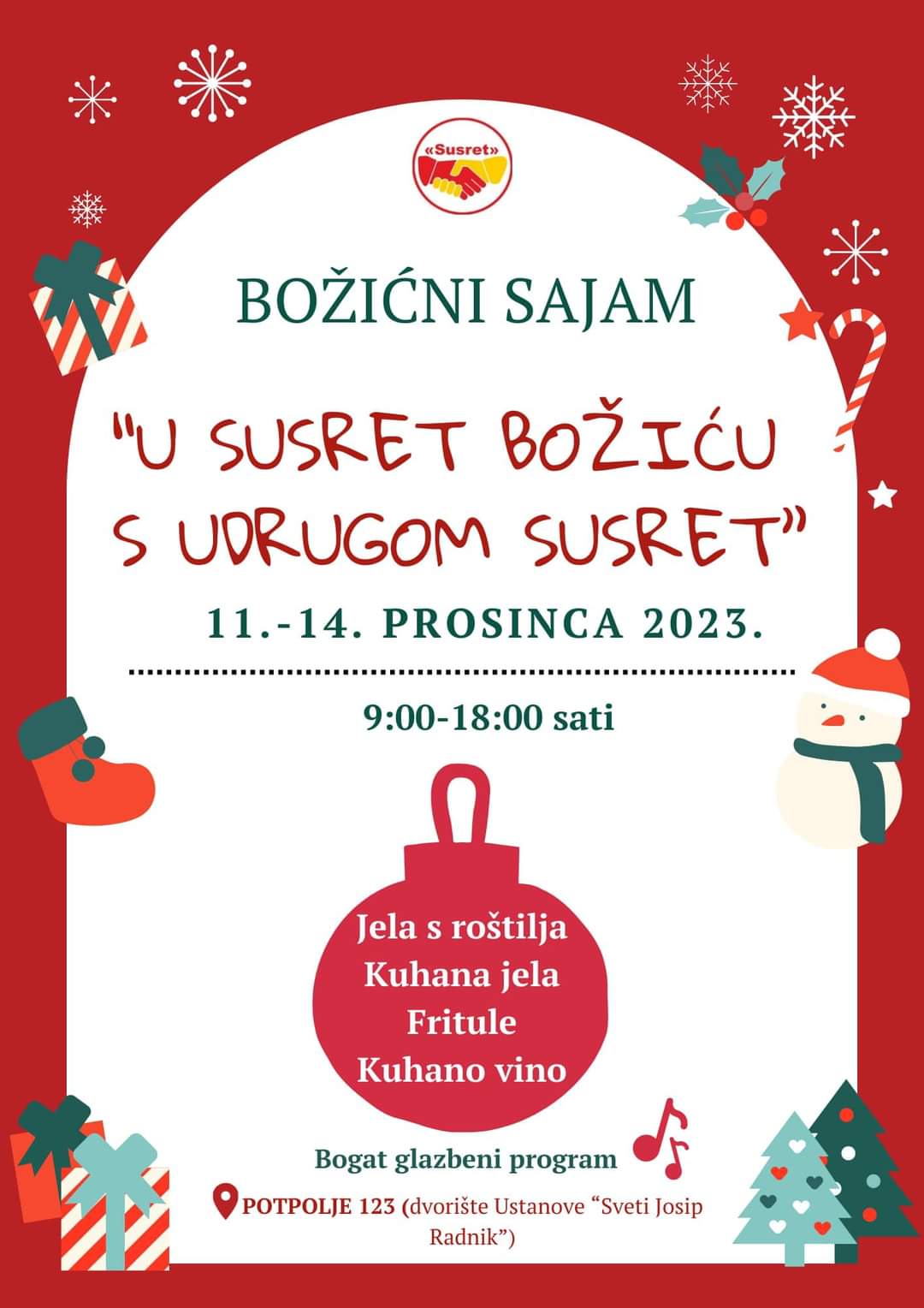 Božićni sajam Udruge Susret „U susret Božiću s Udrugom Susret“ održat će se od 11. do 14. prosinca u vremenu od 9 do 18 sati ispred objekta Ustanove Edukacijsko-rehabilitacijskog centra „Sveti Josip Radnik“ u Potpolju.