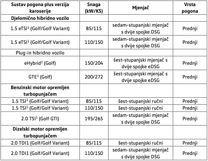 Novi plug-in hibridni pogoni u Golfu nude povećanu snagu i električni doseg od oko 100 km, a dodatno su opremljeni funkcijom brzog punjenja istosmjernom strujom. Ukupno devet različitih opcija – blagi hibridi (eTSI), plug-in hibridi (eHybrid i GTE), benzinci s turbopunjačem (TSI) i dizelaši s turbopunjačem (TDI) – bit će dostupno u fazi lansiranja.