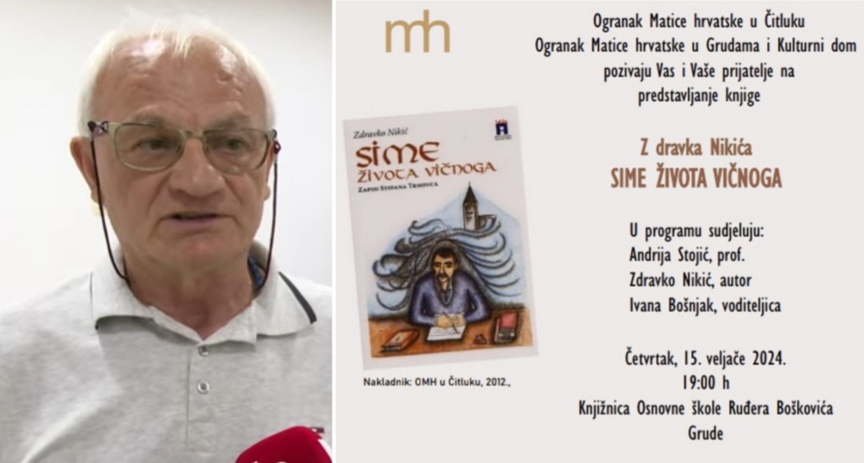 U organizaciji Ogranaka Matice hrvatske u Čitluku, Ogranaka Matice hrvatske u Grudama i Kulturnog doma Grude, u četvrtak 15. veljače bit će upriličeno predstavljanje knjige “Sime života vičnoga” autora Zdravka Nikića.