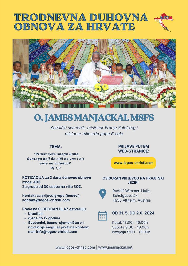 Logos Christi najavljuje novu trodnevnu duhovnu obnovu koju će voditi O. James Manjackal, priznati misionar pape Franje i misionar sv. Franje Saleškog. Ovaj trodnevni duhovni seminar održava se od 31. svibnja do 02. lipnja 2024. u Rudolf-Wimmer-Halle u Altheimu, Austriji.