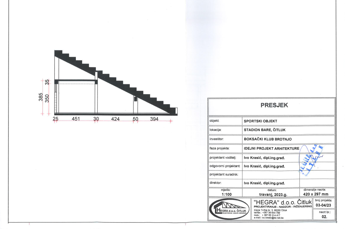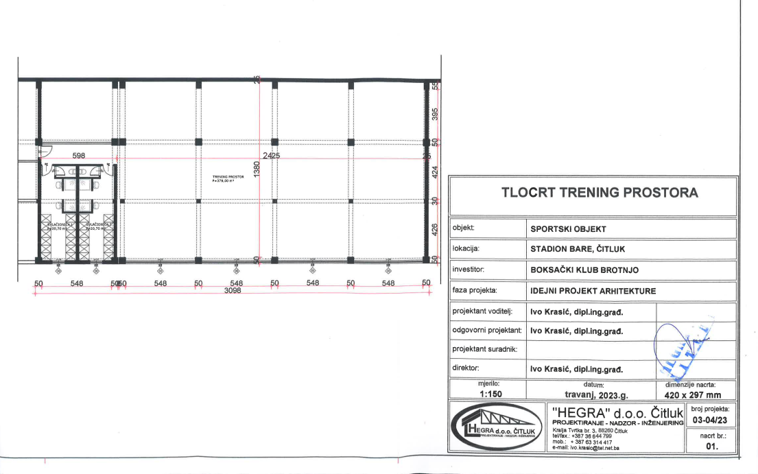 „Klub je dobio odobrenje za adaptaciju dijela prostora ispod tribina Stadiona ‘Bare’. Projekt je izradiodipl. ing. građ. Ivo Krasić. Njime je predviđena pregradnja dijela ispod tribina, izgradnja veće dvorane za treninge, dva toaleta s tuševima, dvije svlačionice i ureda za administrativne poslove. Građevinske radove koji su pri krajuobavlja firma Procons d.o.o. Čitluk, nakon čega slijedi bravarski, izolaterski i keramičarski dio posla. Već smo pripremili pozive za ponude i za ovaj dio radova“, kazao je Bošnjak.
