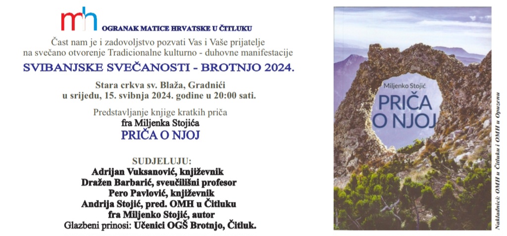 Tradicionalna kulturno-duhovna manifestacija „Svibanjske svečanosti – Brotnjo 2024“ bit će otvorena u srijedu, 15. svibnja u staroj crkvi sv. Blaža u Gradnićima. U staroj gradnićkoj crkvi s početkom u 20 sati bit će predstavljena knjiga kratkih priča autora fra Miljenka Stojića „Priča o njoj“.
