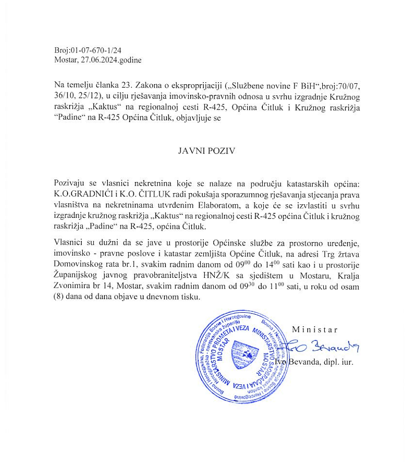Na temelju članka 23. Zakona o eksproprijaciji („Službene novine F BiH“,broj:70/07, 36/10, 25/12), u cilju rješavanja imovinsko-pravnih odnosa u svrhu izgradnje Kružnog raskrižja „Kaktus“ na regionalnoj cesti R-425, Općina Čitluk i Kružnog raskrižja “Padine“ na R-425 Općina Čitluk, Ministarstvo prometa i veza HNŽ objavilo je javni poziv.