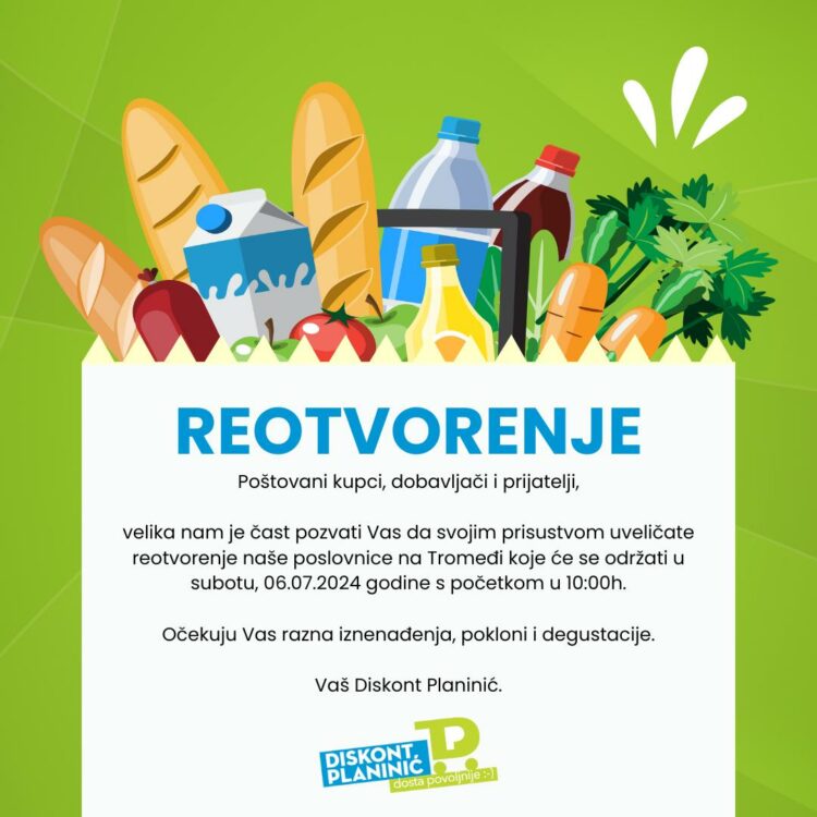 Iz diskonta Planinić pozivaju sve svoje kupce, dobavljače i prijatelje na reotvorenje poslovnice na Tromeđi koje će se održati u subotu, 06.07.2024 godine s početkom u 10:00h.
