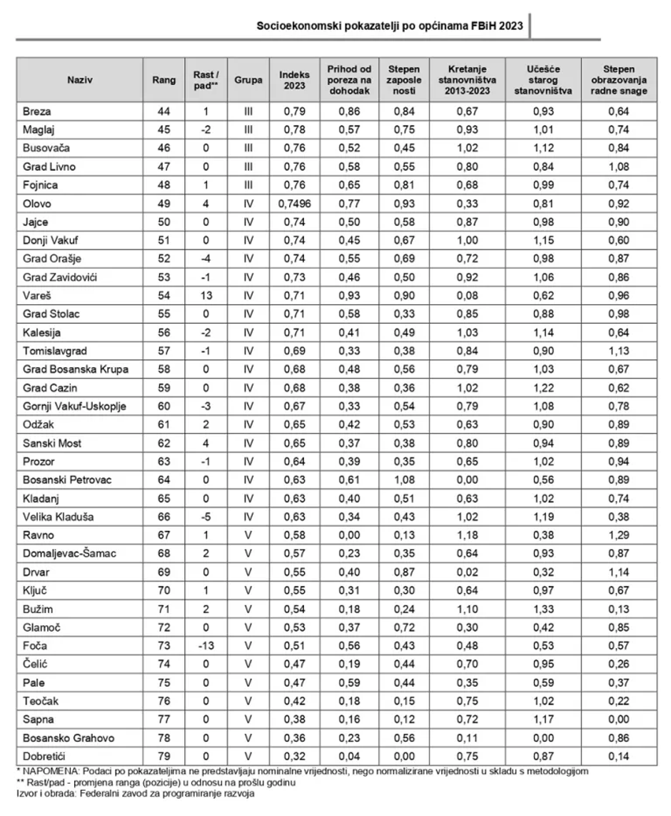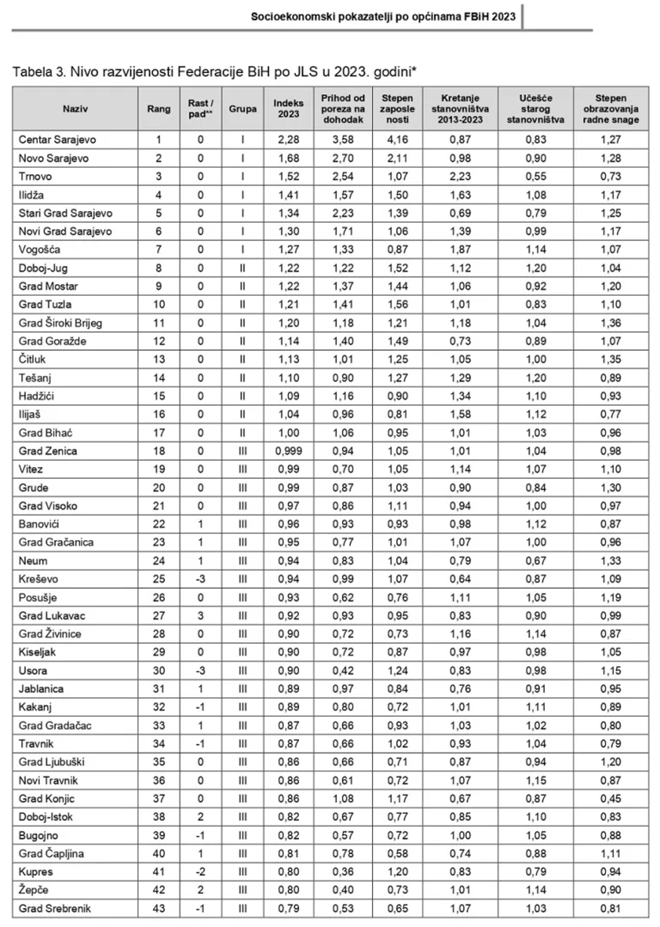 Inače, svrha dokumenta “Socioekonomski pokazatelji po općinama u Federaciji Bosne i Hercegovine 2023.” je da se sagledaju osnovni društveno-ekonomski pokazatelji razvoja u jedinicama lokalne samouprave (JLS) FBiH te da se rangiraju lokalne zajednice i županije prema nivou razvijenosti.