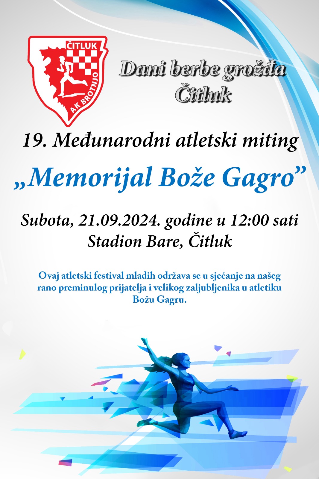 U subotu, 21. rujna 2024., u sklopu 69. turističko-kulturne gospodarstvene manifestacije Dani berbe grožđa, održava se tradicionalni 19. po redu atletski miting “Memorijal Bože Gagro”.