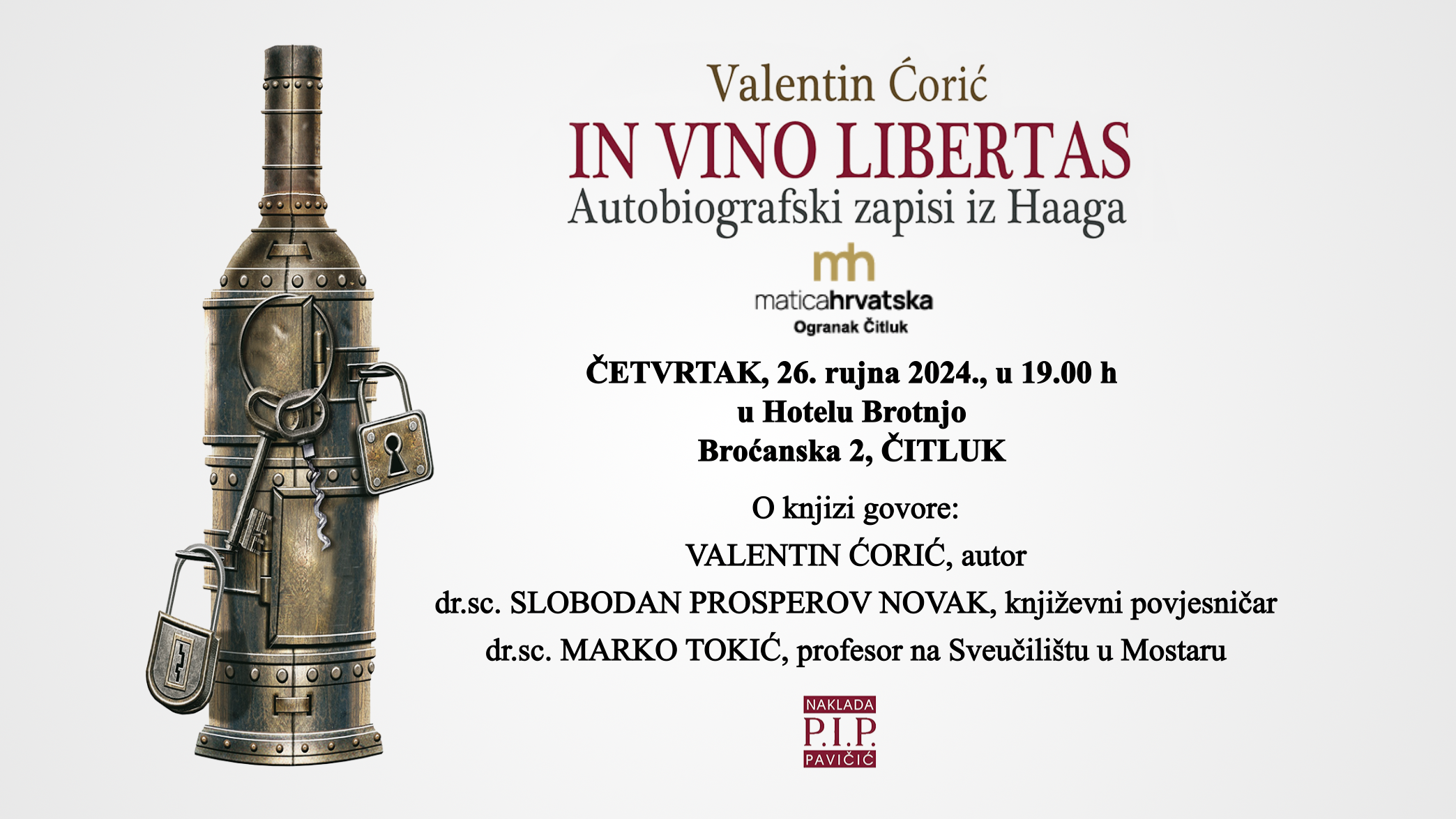 U četvrtak 26. rujna, u hotelu Brotnjo s početkom u 19 sati bit će upriličeno predstavljanje knjige Valentina Ćorića “In vino libertas”.