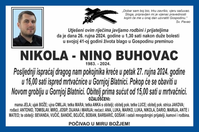 S neizmjernom tugom i boli, zahvalni za svu dobrotu i ljubav koju nam je pružao, opraštamo se od našega Nikole Nine Buhovca, utemeljitelja portala Brotnjo.info i dugogodišnjeg medijskog djelatnika, kolege i prijatelja.