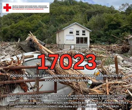 Crveni križ Federacije BiH, koji koordinira prikupljanje humanitarne pomoći, podsjećamo da pomoći možete i pozivom na broj 17023, kojim donirate 2 KM za stanovništvo pogođeno poplavama.
