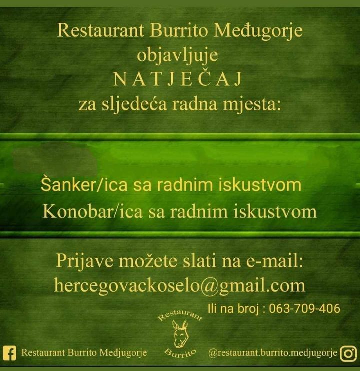Restoran Burrito Međugorje raspisuje Natječaj za sljedeća radna mjesta: