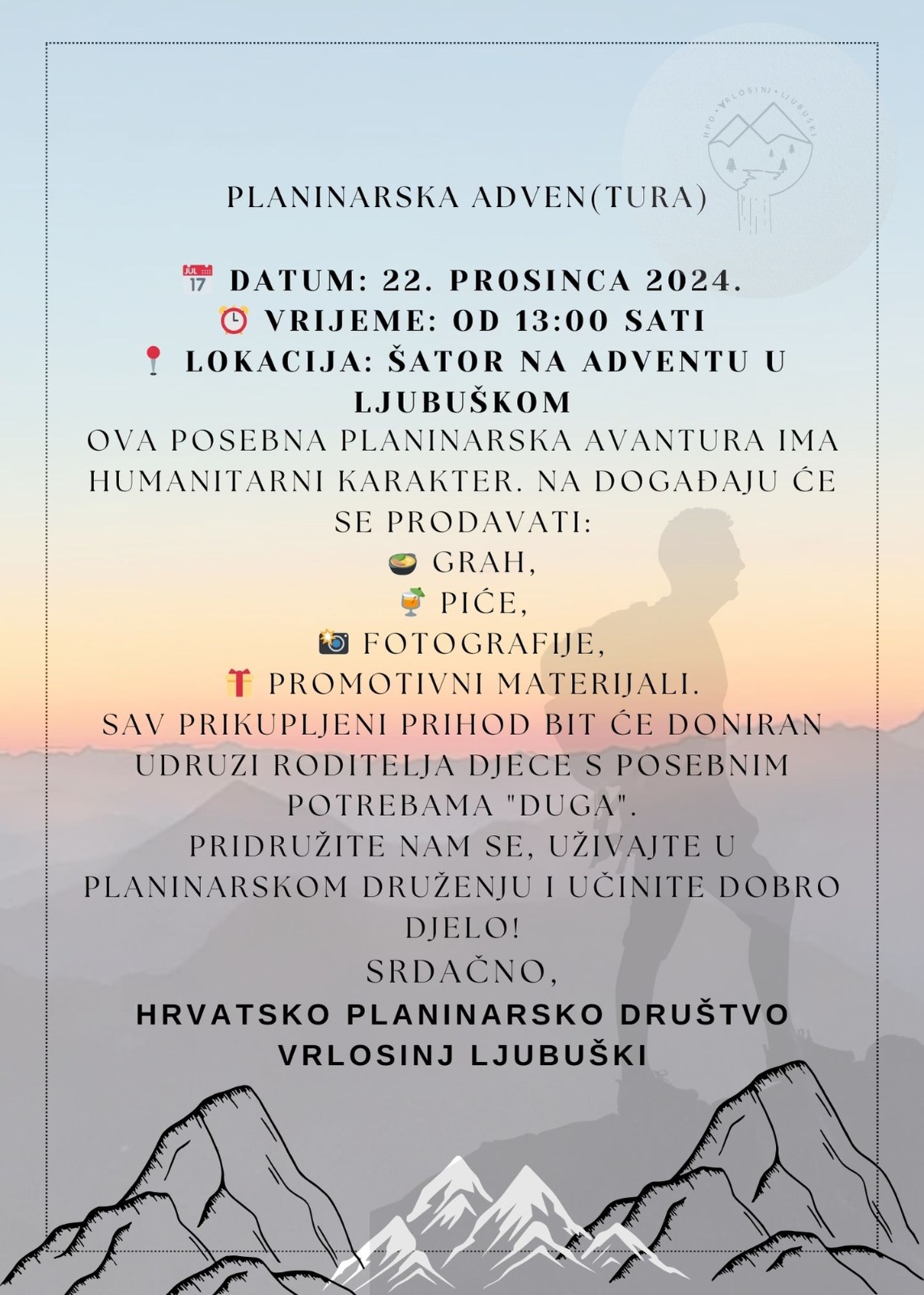 Hrvatsko planinarsko društvo Vrlosinj u nedjelju, 22. prosinca organizira božićno druženje Planinarska adven(tura). Ova posebna planinarska avantura ima humanitarni karakter i prihodi od prodaje pića, hrane, fotografija i promotivnog materijala bit će donirani Udruzi za djecu s posebnim potrebama “Duga”.