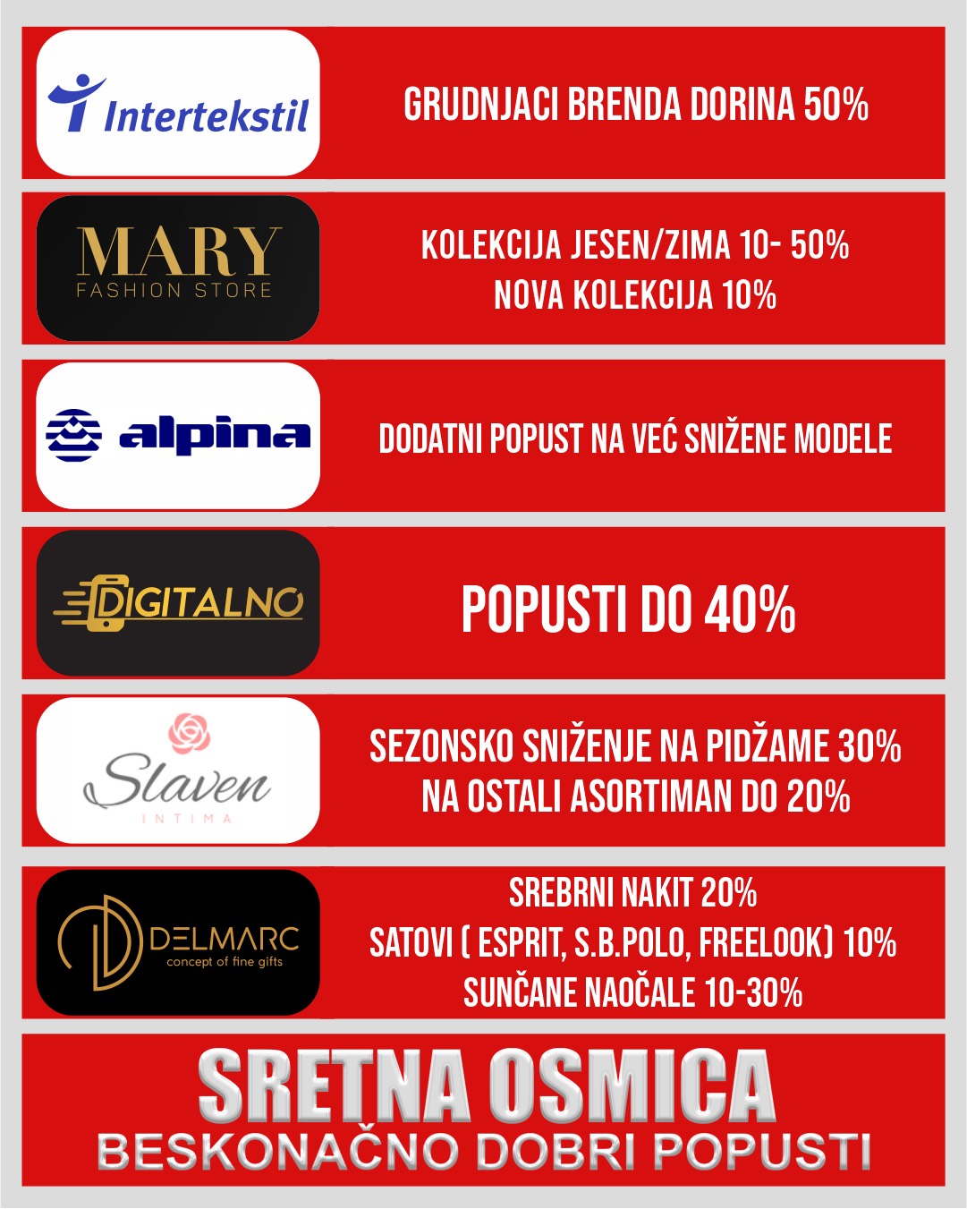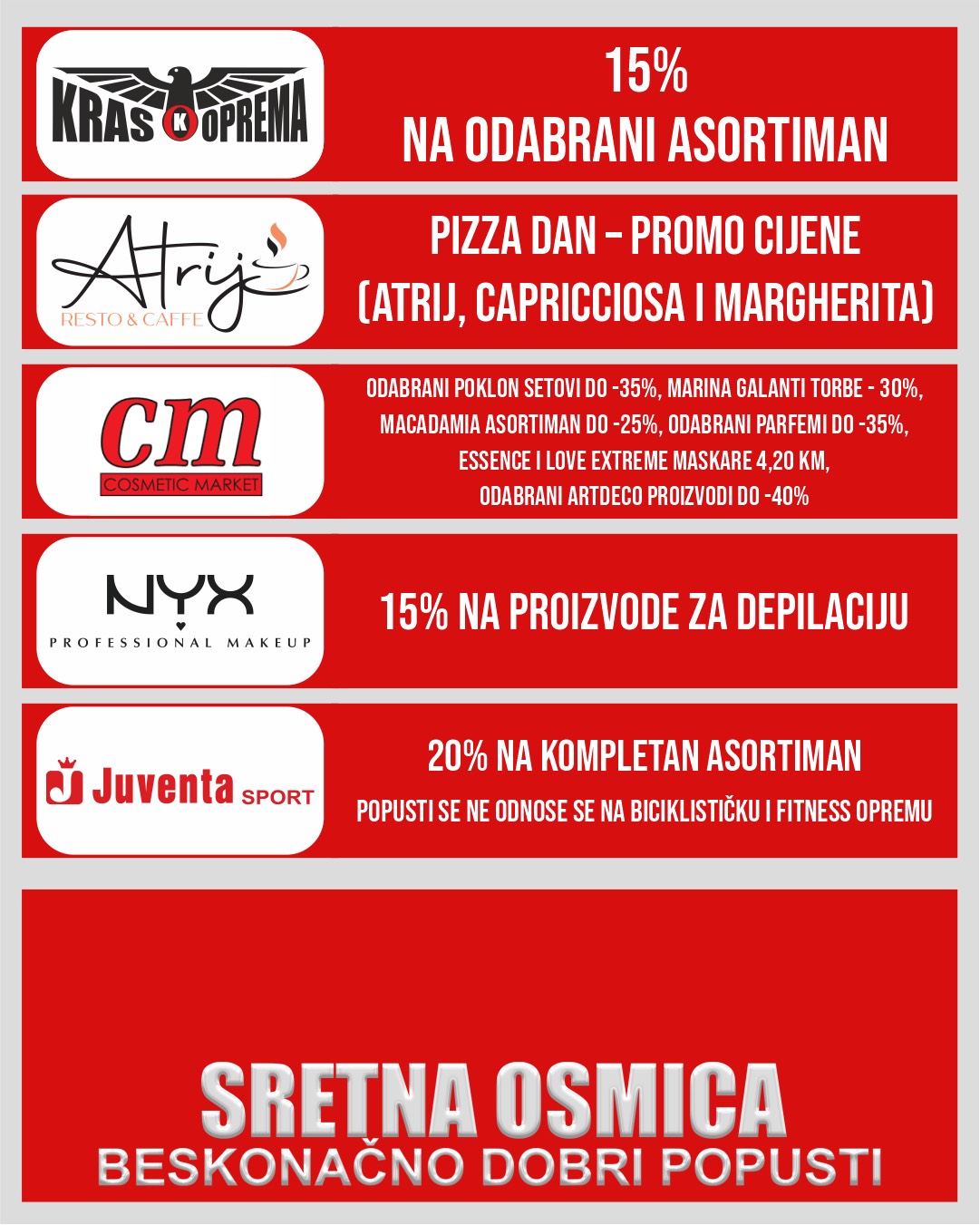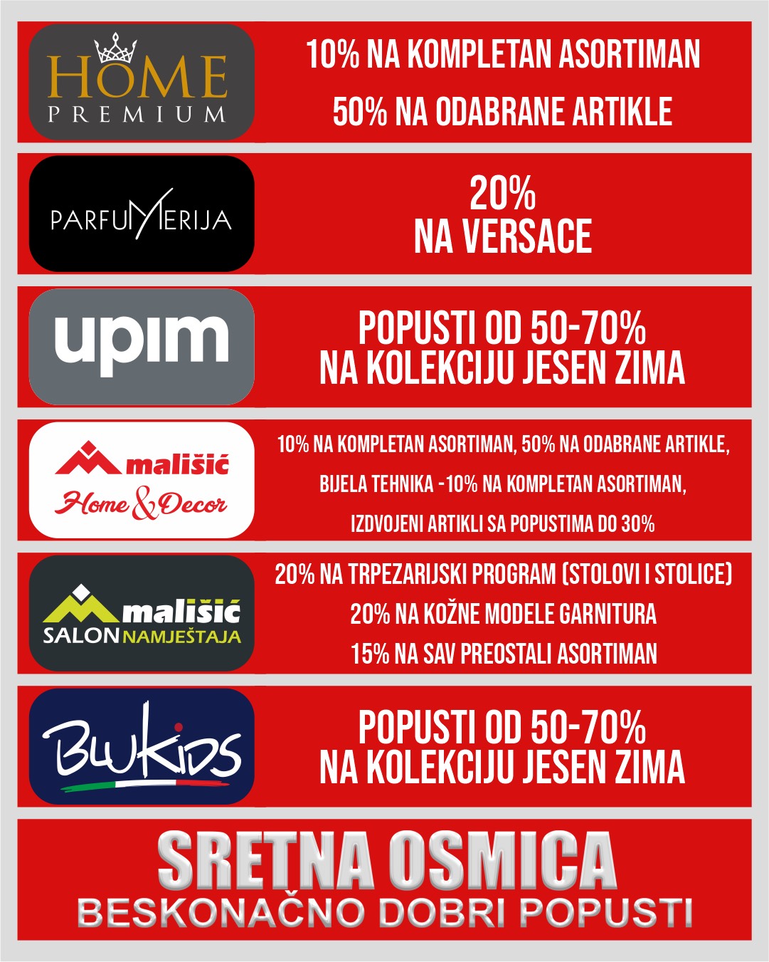 Sretna Osmica i ovoga mjeseca donosi odlične akcijske popuste, pogodnosti i sniženja u prodajnom centru Mališić Međugorje.