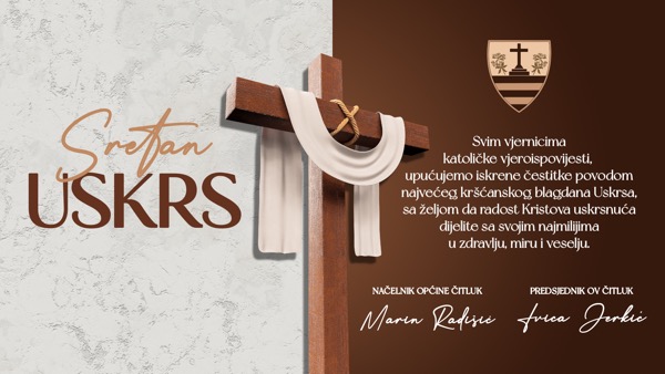 Svim vjernicima katoličke vjeroispovijesti, upućujemo iskrene čestitke povodom najvećeg kršćanskog blagdana Uskrsa, sa željom da radost Kristovog uskrsnuća dijelite sa svojim najmilijima u zdravlju, miru i veselju.