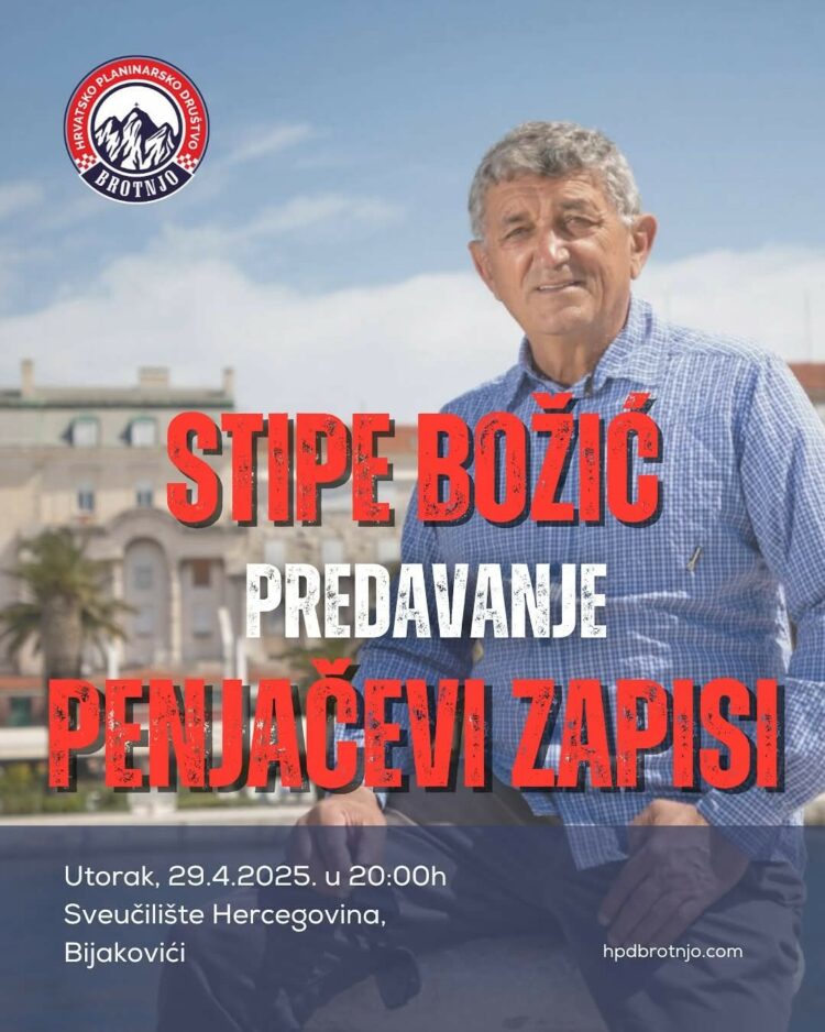 HPD Brotnjo organizira predavanje Stipe Božića, jednog od najuspješnijih hrvatskih alpinista, pod nazivom „Penjačevi zapisi – Put do najviših vrhova svijeta”, koje će se održati u utorak, 29. travnja 2025. godine u 20 sati u Bijakovićima.