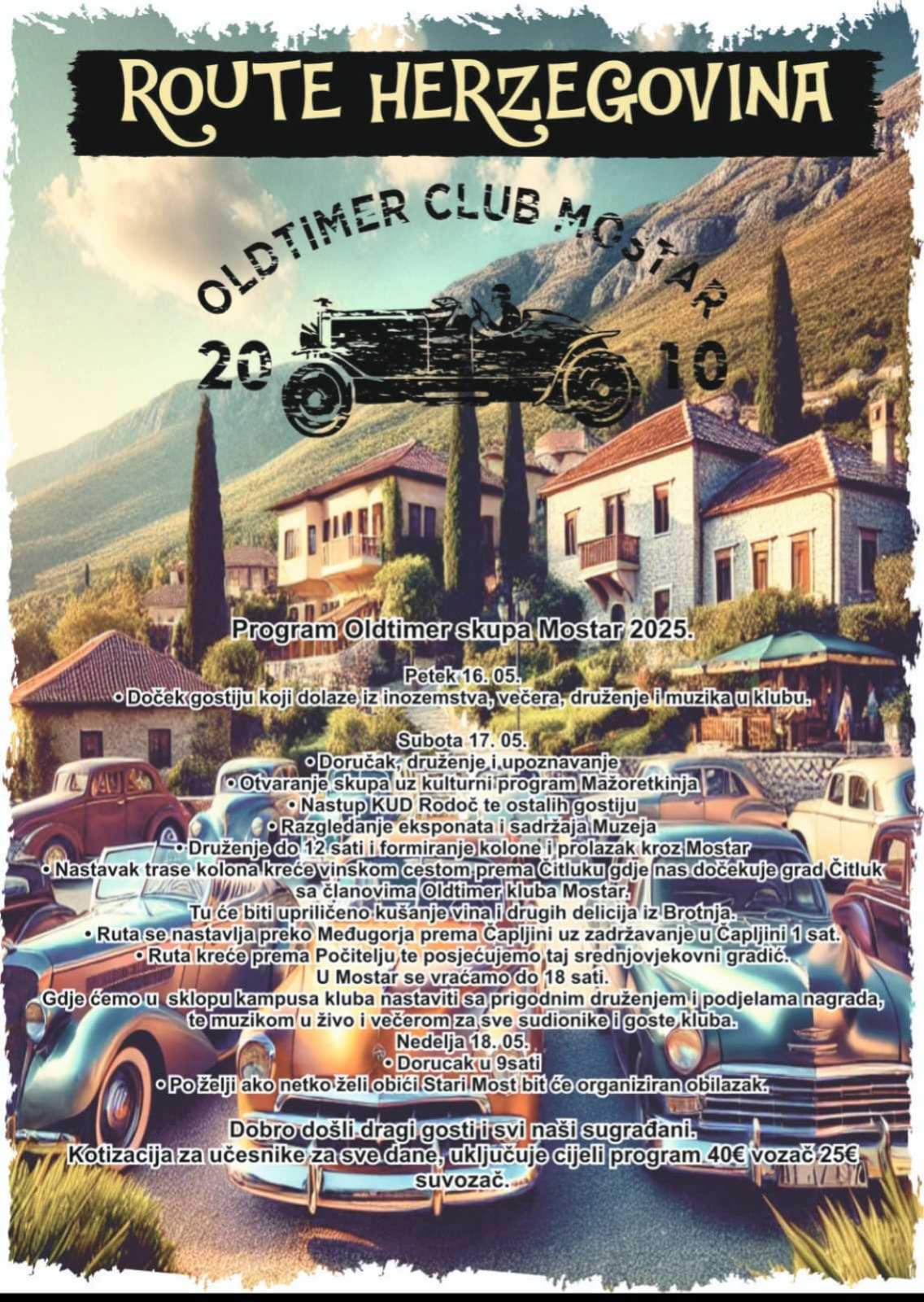 Oldtimer klub Mostar sa ponosom najavljuje Međunarodni oldtimer skup Mostar 2025, koji će se održati od 16. do 18. svibnja 2025. godine. Riječ je o prestižnom okupljanju ljubitelja starih vozila koje će se održati pod nazivom “Route Herzegovina”, a obuhvaća raznovrstan program, vožnje kroz Hercegovinu, izložbe i zabavni sadržaj za sve generacije.