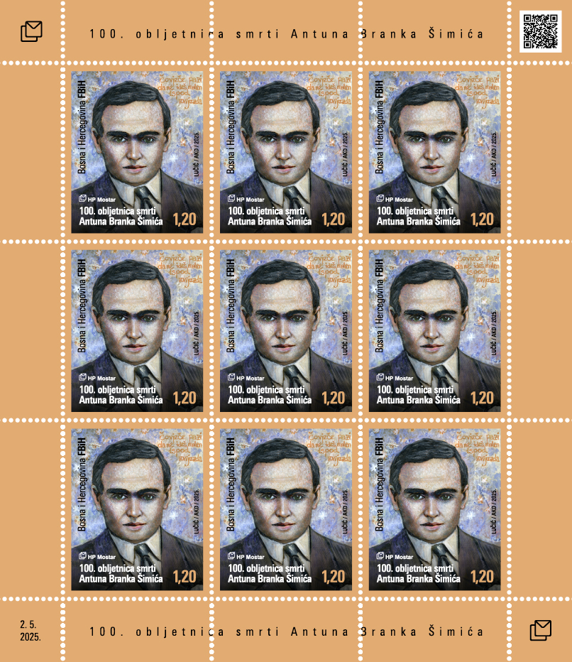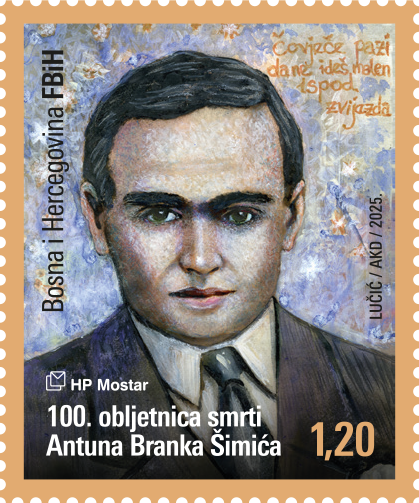 Hrvatska pošta (HP) Mostar tiskala je prigodne poštanske marke kojima je obilježila 100. obljetnicu smrti Antuna Branka Šimića, velikog hrvatskog pjesnika, kritičara i prevoditelja. Jedan od najistaknutijih hrvatskih pjesnika modernizma rođen je u Drinovcima 18. 11. 1898. godine. Nakon što je u Širokom Brijegu završio tri razreda na Franjevačkoj klasičnoj gimnaziji kratko boravi u Mostaru, četvrti razred gimnazije upisuje u Vinkovcima, a školovanje nastavlja u zagrebačkoj donjogradskoj gimnaziji. Već s petnaest godina objavljuje pjesmu u časopisu „Luč“, a rane pjesme pejzažne lirike objavljuje od 1913. do 1917. Nakon što je morao napustiti gimnaziju, jer školske vlasti učenicima nisu dopuštale izdavanje javnih tiskovina, u potpunosti se posvetio pisanju.