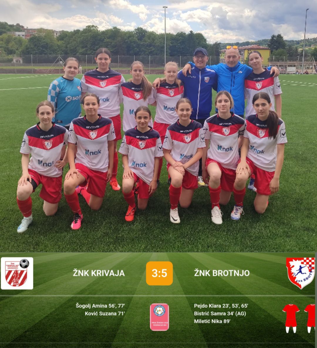 Nogometašice ŽNK Brotnjo ostvarile su vrijednu gostujuću pobjedu protiv ekipe ŽNK Krivaja Zavidovići rezultatom 3:5 (0:2). Pogotke za Brotnjo postigle su Klara Pejdo, koja je čak četiri puta zatresla mrežu domaćina, te Nika Miletić koja je dodala jedan pogodak.