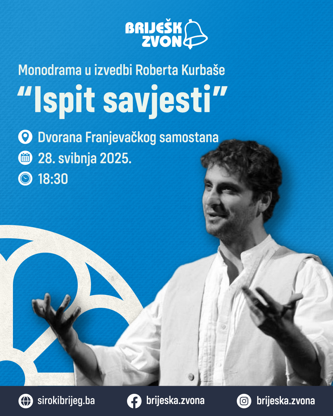 U sklopu kulturne manifestacije Briješka zvona, u srijedu 28. svibnja s početkom u 18:30 sati, u samostanskoj dvorani na Širokom Brijegu bit će izvedena monodrama „Ispit savjesti“, autorski projekt hrvatskog glumca Roberta Kurbaše.