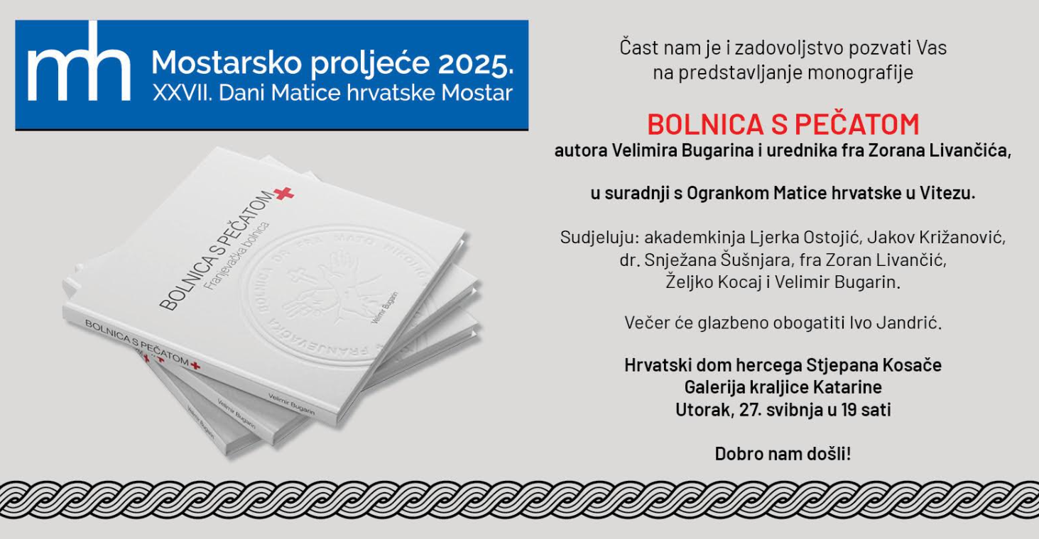 Monografija Bolnica s pečatom autora Velimira Bugarina i urednika fra Zorana Livančića bit će predstavljena u utorak, 27. svibnja, u 19 sati u Galeriji kraljice Katarine Kosače u Mostaru. Uz autora i urednika monografije, u programu predstavljanja sudjelovat će akademkinja dr. Ljerka Ostojić, Jakov Križanović, dr. Snježana Šušnjara i Željko Kocaj, dok će u glazbenome dijelu nastupiti Ivo Jandrić.