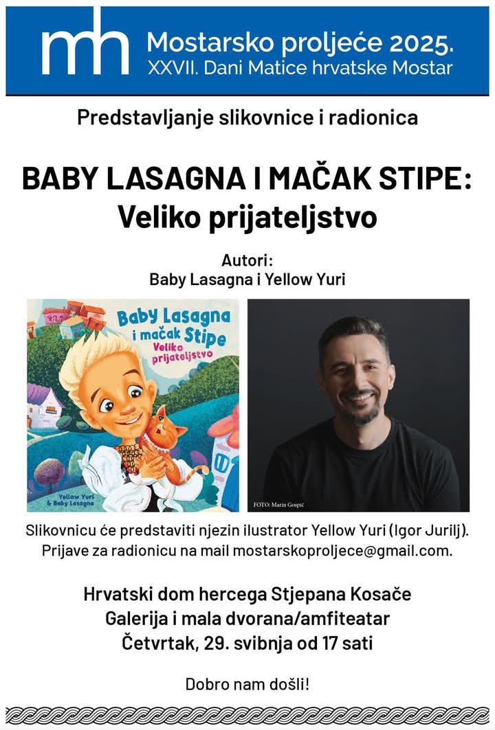 Mostarsko proljeće ni ove godine nije zaboravilo na najmlađe. Tako će u četvrtak, 29. svibnja, od 17 sati u Hrvatskome domu hercega Stjepana Kosače biti predstavljena slikovnica Baby Lasagna i mačak Stipe – Veliko prijateljstvo nastala u suradnji Baby Lasagne i Yellow Yurija te priređena i zanimljiva radionica za djecu. Autor teksta, kao i ilustracija je Igor Jurilj, ilustrator i novinar koji se umjetnički potpisuje kao Yellow Yuri, a koji je oblikovao priču o velikom prijateljstvu mačka Stipe i Baby Lasagne, uz pomoć prošlogodišnjeg favorita Eurosonga i jednog od protagonista – Baby Lasagne.