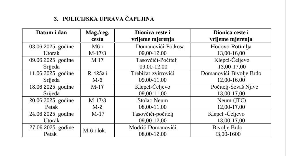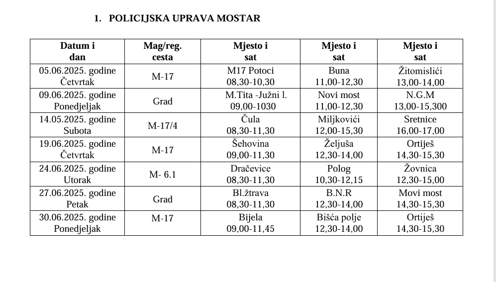Plan radarskih kontrola Uprave policije MUP-a HNŽ za mjesec lipanj 2025. godine:
