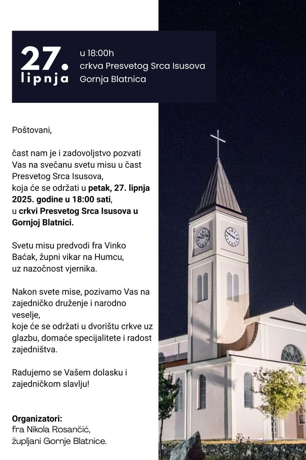 U petak, 27. lipnja 2025. godine, u crkvi Presvetog Srca Isusova u Gornjoj Blatnici, održat će se svečana sveta misa u čast Presvetog Srca Isusova. Sveta misa započinje u 18:00 sati, a predvodit će je fra Vinko Baćak, župni vikar na Humcu