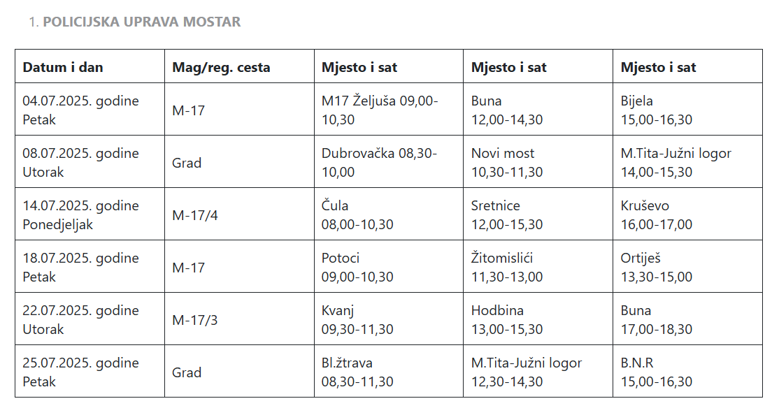 Plan radarskih kontrola za mjesec srpanj 2025. godine, na cestama HNŽ-a: