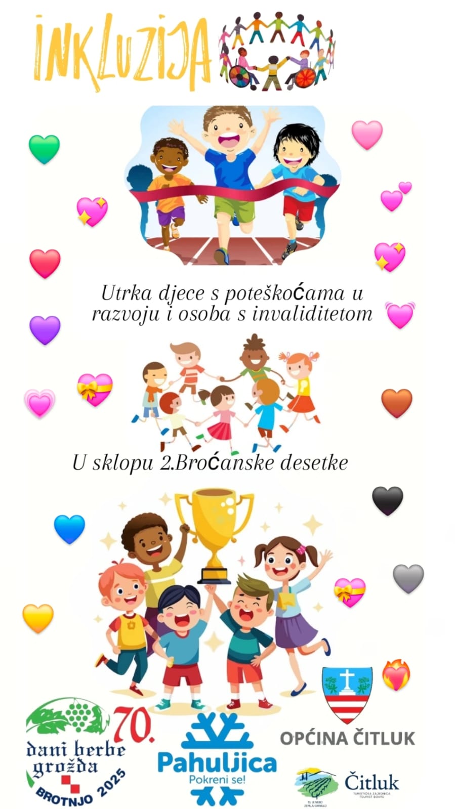 U sklopu 2. Broćanske desetke, cestovne utrke koju organizira Sportska udruga Pahuljica: Pokreni se, ove godine nas očekuje poseban događaj – utrka djece s poteškoćama u razvoju i osoba s invaliditetom. Ova inkluzivna utrka održat će se po prvi put, kao važan iskorak prema stvaranju zajednice koja prihvaća i podržava sve svoje članove.